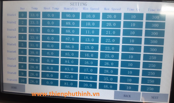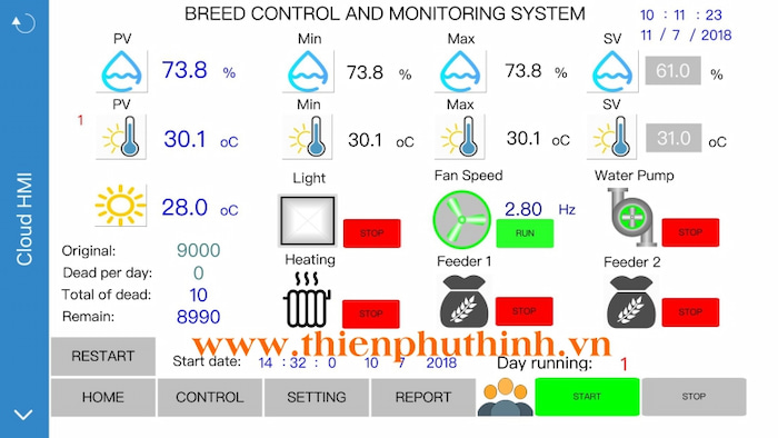 Người chủ trại chỉ cần cài đặt các thông số yêu cầu cho lần đầu tiên và nhấn nút start, các công việc khác như tốc độ quạt, thời gian chạy bơm, cấp cám, … sẽ do bộ điều khiển PLC tự động điều khiển trong suốt quá trình nuôi. Khi chu trình nuôi kết thúc, chỉ cần khởi động lại hệ thống thông qua 1 nút nhấn restart.