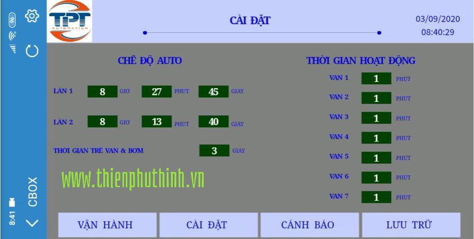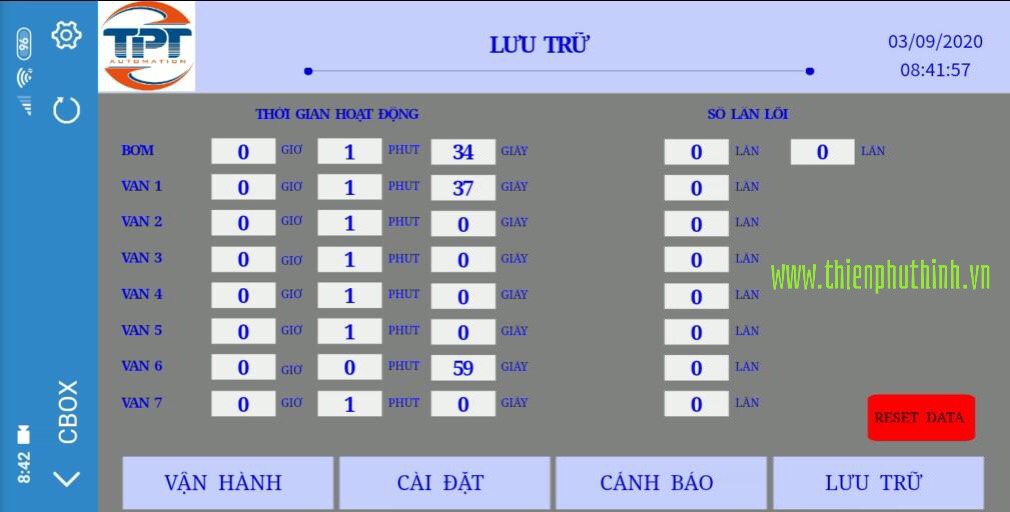 - Lưu thời gian đã hoạt động cho từng van và bơm.