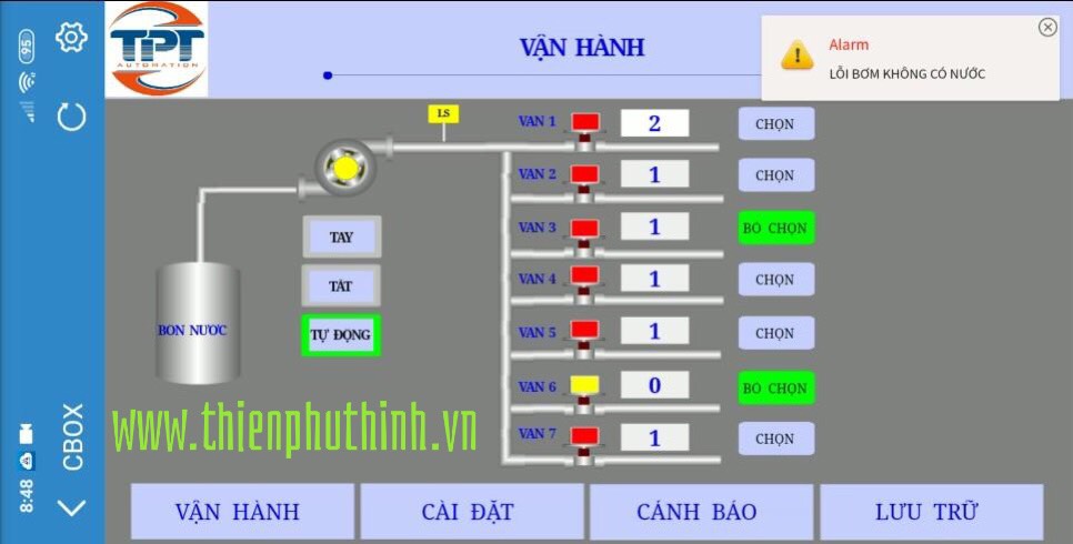 - Báo động khi có sự cố bơm hoạt động không có nước.