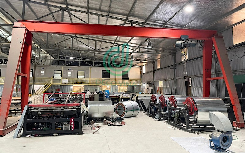 Tôn cuộn (trọng lượng ≤ 5 tấn) được nạp vào trục đỡ cuộn, sau đó rulo kéo dẫn tôn ra khỏi cuộn, đảm bảo cấp liệu liên tục, ổn định cho toàn dây chuyền.