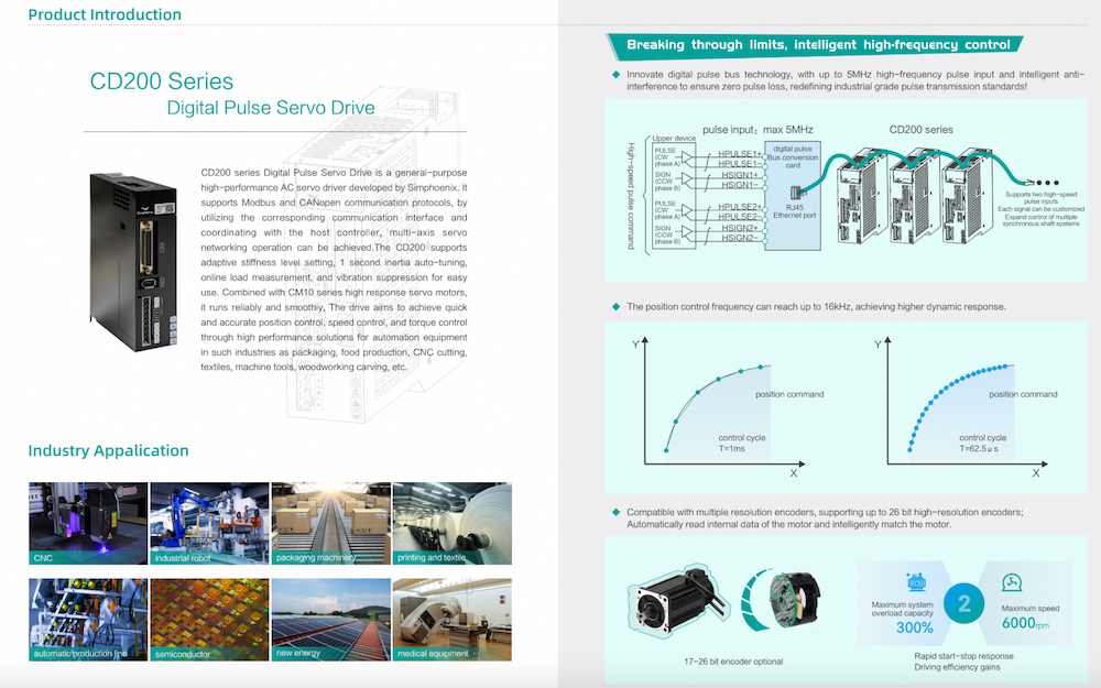 Driver CD200 Series là bộ điều khiển servo xung số hiệu suất cao với các tính năng: