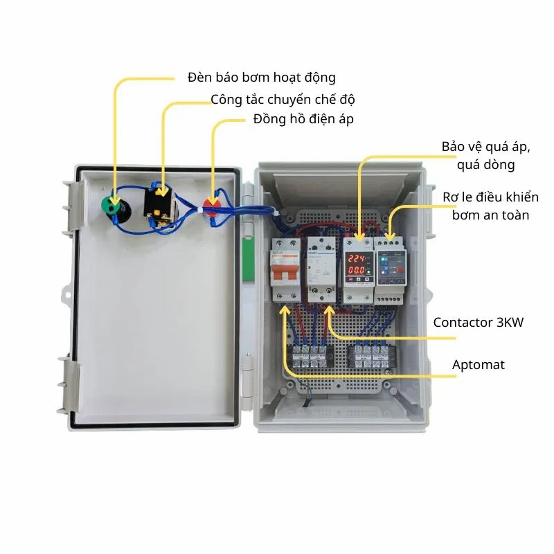 Tủ điều khiển bơm nước 1 pha thường bao gồm các bộ phận chính sau: